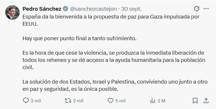 Esta propuesta de liquidación efectiva de Gaza, y también de Palestina, planteada por Trump ha sido muy bien recibida por el presidente del gobierno español, Pedro Sánchez.