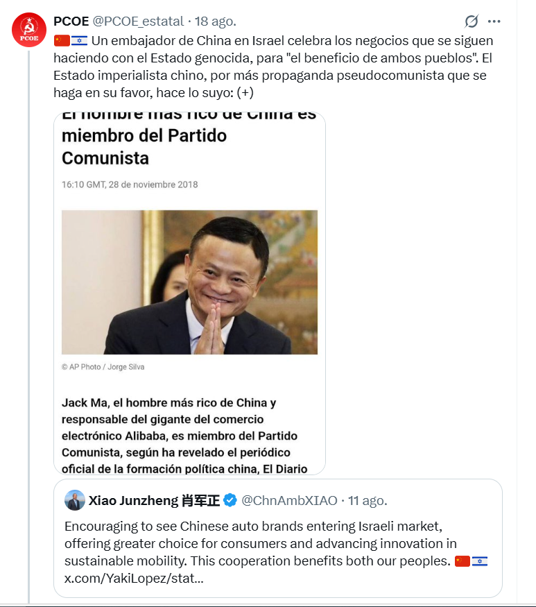 Por otro lado, la actuación de parte del movimiento comunista español está siendo vergonzosa, propia de traidores pequeñoburgueses que es lo que son. Quien mejor está ilustrando esto que decimos es el Partido Comunista de los Pueblos de España (PCPE) y los diferentes “partidos” que lo componen, no dudando en blanquear a la burguesía, a los partidos oportunistas que están en el gobierno, descollando esta forma traicionera de actuar en Valencia, Alicante o Canarias, tal y como nuestro Partido en Canarias denunció los pasados 9 de septiembre en comunicado “¿Apoyo a Palestina o instrumentalización del genocidio?” y 7 de agosto en el comunicado “La farsa del Estatuto de Neutralidad de Canarias”. Un Partido que engaña al proletariado indicando abiertamente que China es socialista cuando en China no sólo prevalece la propiedad privada sobre los medios de producción, sino que ésta es el segundo socio comercial más importante que tiene Israel – tras EEUU.
